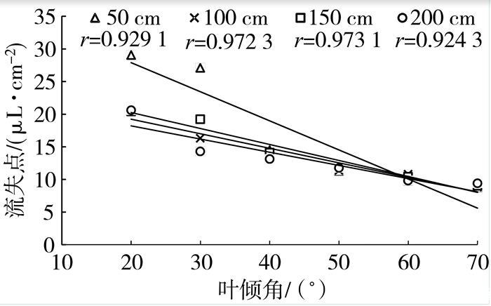 流失點是農藥噴施量的關鍵決定參數,當農藥噴施量超過流失點,會減少藥液在葉片表面的持留量,降低藥效且造成農藥的浪費。圖4表明,流失點與葉傾角呈顯著負相關,且隨著噴霧距離增加,斜率降低,說明葉傾角和噴霧距離對流失點均有顯著影響。