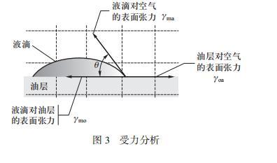 液滴爆炸現(xiàn)象的第二階段邊緣處的液滴產(chǎn)生液滴噴發(fā)現(xiàn)象,在該過程中液滴中部較厚的部分不斷向邊緣輸送液體,因此會穩(wěn)定持續(xù)一段時間。為解釋這一階段,先從表面張力入手,因為接觸角的不同,水對油的表面張力大于乙醇對油的表面張力,則混合液體對油層的界面張力介于水和乙醇之間。混合液滴中乙醇的比例越大,混合液體對油層的界面張力越小,受到向內(nèi)的張力減小,這樣整體向外的張力增大,這是產(chǎn)生向外推動的驅(qū)動力的重要原因。可見界面張力直接決定了液滴在界面上的擴(kuò)散和運動。