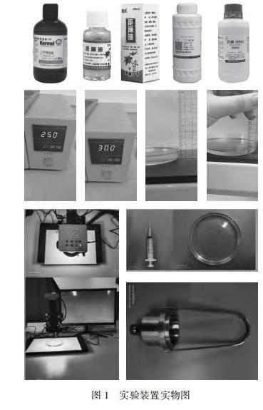 為了還原物理現(xiàn)象,初步探究液滴爆炸的原因,本文首先進(jìn)行了預(yù)實驗。實驗中所用到的物品包括:醫(yī)用75%酒精和蒸餾水混合形成水混合物液滴,家用菜籽油用作油池,普通藍(lán)墨水染色。在室溫環(huán)境下進(jìn)行實驗,預(yù)實驗中發(fā)現(xiàn)普通藍(lán)墨水染色現(xiàn)象不明顯,改進(jìn)為采用甲基藍(lán)染色劑進(jìn)行染色。正式實驗時準(zhǔn)備了不同種類的水混合物(乙醇、二乙二醇丁醚),不同種類的疏水性物質(zhì)(硅油、花生油、蓖麻油),不同厚度的疏水性物質(zhì)(5 mm、10 mm),設(shè)置合適的濃度梯度,采用恒溫水浴鍋來測定溫度。在顯微鏡下觀察液滴的運動過程,精準(zhǔn)測定液滴大小,利用注射器定量控制滴入液滴的體積,再利用黏度計測量黏性系數(shù),并對實驗誤差進(jìn)行了修正。