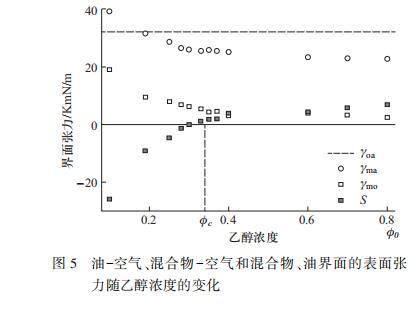 乙醇的初始濃度是本實驗中的一個關鍵參數。在實驗中我們觀察到當乙醇初始濃度φ0大于一臨界濃度φc時,液滴出現不穩定性。為了解釋不穩定性的發生,本文測量了相應油~空氣、混合空氣和混合油界面的界面張力γoa、γma和γmo.圖5顯示了油~空氣、混合物~空氣和混合物~油界面的表面張力隨乙醇濃度的變化。油~空氣的界面張力γoa不變,混合物~空氣界面張力γma和混合物~油的界面張力γmo隨液滴中乙醇含量增大而減小。定義擴散參數S=γoa-γma-γmo.當擴散參數為正值時,液滴會擴散到油(疏水性液體)上,發現該標準與液滴不穩定性的開始一致。隨著乙醇初始含量φ0增大,S會逐漸增大,存在一個臨界乙醇含量φc,且φc處S=0,因此可認為:只有乙醇的初始含量大于φc時,才會發生“液滴爆炸”現象。
