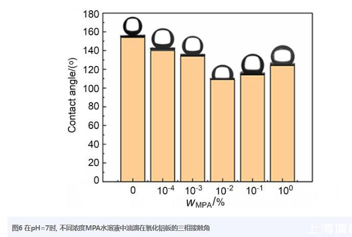 接觸角測量可以用來表征納米顆粒經(jīng)改性后的親疏水性。本研究是以氧化鋁板作為模擬納米氧化鋁的基材,研究癸烷油滴在不同MPA濃度的溶液中(pH=7)在氧化鋁板上的三相接觸角,如圖6所示。當(dāng)MPA濃度為0時,油滴與氧化鋁板的接觸角超過150°,說明氧化鋁在沒有MPA分子時具有較強的親水性。隨著MPA濃度逐漸增加,接觸角不斷降低,這是因為MPA濃度越高,在氧化鋁板上吸附的MPA分子越多,疏水性越強,油滴則可更容易吸附在界面上,當(dāng)MPA濃度為0.01%(w)時,接觸角降到最低(110°)。然而,當(dāng)進(jìn)一步增加MPA濃度,接觸角反而逐漸升高,這是因為過多的Bola型分子結(jié)構(gòu)MPA使親水性反而增加。該結(jié)果與Zeta電勢的結(jié)果趨勢類似,可以進(jìn)一步印證了MPA分子吸附在了納米Al2O3顆粒表面上。