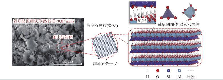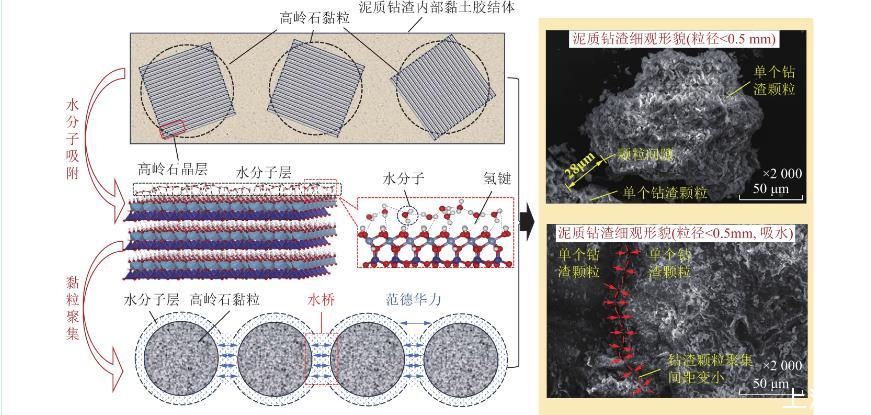 圖2中,在微觀尺度層面,由于高嶺石形成過程中發(fā)生同晶置換,使晶層表面帶永久負(fù)電荷。當(dāng)高嶺石黏粒遇水時(shí),水分子的偶極性使氫原子易與高嶺石晶層表面電負(fù)性較強(qiáng)的氧原子結(jié)合形成氫鍵,同時(shí),吸附在晶層表面的水分子之間也會(huì)通過氫鍵連接,該過程即為水分子的吸附過程。當(dāng)?shù)?層水分子被高嶺石黏粒吸附后,其外側(cè)氧原子呈負(fù)電性,繼續(xù)與第2層水分子的氫原子以氫鍵形式結(jié)合,最終形成多層水分子“水膜”。高嶺石黏粒不斷吸水?dāng)U層,使鉆渣顆粒體積不斷膨脹,同時(shí)伴隨鉆渣內(nèi)部非泥質(zhì)礦物的溶解,高嶺石黏粒間距變小,并通過外側(cè)“水膜”相互吸附,構(gòu)成“水橋”,使得多個(gè)高嶺石黏粒能夠在遇水后聚集,形成更大的團(tuán)聚體。