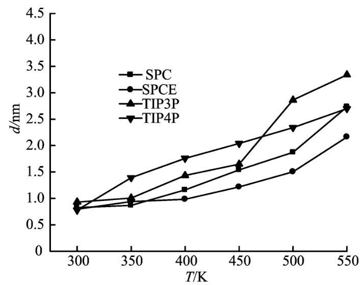 根據“10-90”法則進行計算,分別求得SPC、SPCE、TIP3P和TIP4P在300~550 K的界面厚度如圖6所示。