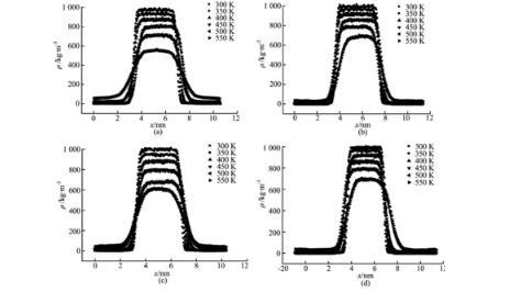 模擬分子數N=1 327,四種水分子模型分別在溫度T=300、350、400、450、500和550 K時,模擬得到的密度分布如圖4所示。從圖4可以看出,曲線可以劃分為三個部分,分別為汽相主體、液相主體以及氣—液界面層。隨著溫度的增加,液相主體密度逐漸降低,氣相主體密度逐漸升高,氣—液界面區域逐漸變寬。
