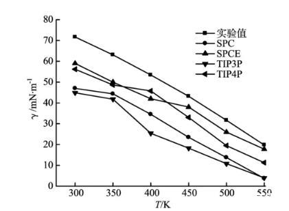 四種水分子模型分別在溫度T=300、350、400、450、500和550 K時,模擬得到界面張力,如圖7所示。從圖7中可以看出,隨著體系溫度的升高,界面張力降低,并且模擬值與實驗值之間誤差逐漸減小。SPCE模型得到的界面張力與實驗值的誤差較小。