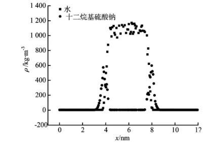 向純水中加入十二烷基硫酸鈉表面活性劑,水分子3 000個,十二烷基硫酸鈉20個,模擬得到300 K下水—表面活性劑體系的密度分布,如圖8所示。由圖8可見,對于只有水的體系來說,其密度變化基本是符合由汽相到液相逐漸增加的趨勢,而對于加入的表面活性劑十二烷基硫酸鈉的體系來說,其密度的變化情況與只有水的體系有明顯的不同。從圖8可以看出,在氣—液兩相的過渡區域,加表面活性劑的體系密度出現明顯的增長。
