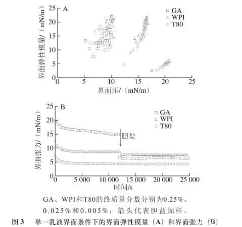 由圖3A可知,GA和WPI界面的彈性模量值基本一致,比T80界面的彈性模量值高很多。說明此質量分數條件下GA和WPI形成的界面相對T80有更好的界面黏彈性。這是由于大分子GA和WPI具有較強的空間位阻,在乳滴界面可形成較厚的吸附層,乳滴空間穩定性較好,可在一定程度上抵御外力造成的變形。T80屬于小分子表面活性劑,在界面吸附致密整齊,但乳滴的空間穩定性較差,易發生變形和聚集。圖3B表明,在加入膽鹽后,GA界面的界面張力降低值ΔT為8.42 mN/m,T80界面的界面張力基本不變,WPI界面的界面張力降低值ΔT為1.09 mN/m,由此證明T80的抗膽鹽取代能力最優,其次為WPI和GA。3種乳化劑所呈現的界面特性與3種乳液的消化動力學規律相吻合。采用界面流變技術可有效評價乳化劑的界面特性,腸液組分對乳滴界面特性造成的影響以膽鹽取代最為顯著。因此,通過評價膽鹽在界面的取代能力,可在一定程度上判斷乳液的脂肪消化動力學規律。