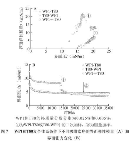 圖7 WPI和T80復(fù)合體系條件下不同吸附次序的界面彈性模量(A)和界面張力變化(B)