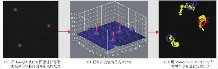 實驗采用Olympus顯微鏡(配備60倍物鏡)觀察顆粒在膜上的布朗運動,同時利用電子增益高速攝像機(jī)(Andor 897 EMCCD)進(jìn)行拍攝。每個視頻拍攝時間為200 s,幀頻為0.05 s,曝光時間5 ms,圖像尺寸為300像素×300像素,分辨率為0.26μm/m。采集原始圖像中的顆粒灰度值不符合標(biāo)準(zhǔn)高斯分布,因此使用圖像處理軟件ImageJ對圖像進(jìn)行背景去噪聲(Background Subtraction)和高斯模糊(Gauss-ian Blur)處理(圖3(a)),使顆粒灰度值達(dá)到標(biāo)準(zhǔn)高斯分布(圖3(b))。之后用Video Spot Tracker軟件定位每個顆粒的灰度峰值(圖3(c)),即顆粒質(zhì)心,定位誤差僅為0.5像素,進(jìn)而對顆粒二維運動軌跡(平面)進(jìn)行實時跟蹤。軟件自動將顆粒在每一時刻的像素位置坐標(biāo)存入計算機(jī)中,使用MATLAB計算顆粒在不同時間間隔Δt內(nèi)沿和方向的位移,計算公式如下: