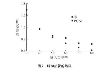 結果表明在100W的加熱功率下,PQAI脈動熱管的熱阻比純水脈動熱管降低了20.8%。綜上所述,以PQAI水溶液作為工質并經氧乙炔正火處理的脈動熱管表現出較好的傳熱性能。