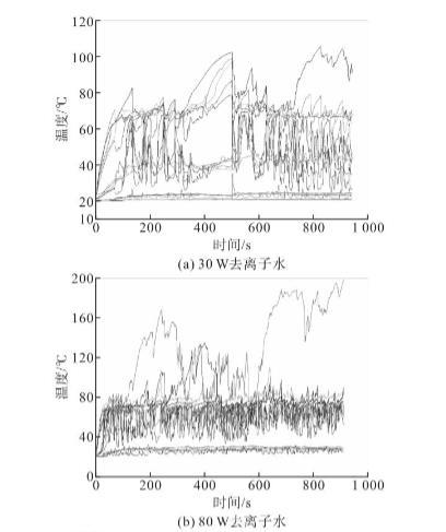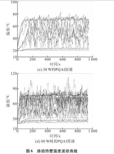 研究了充灌量對脈動熱管運行穩定性和熱性能的影響,結果表明50%為最佳充灌率。因此,本文采用了50%的充灌率。圖6顯示了不同加熱功率下采用去離子水或PQAI水溶液脈動熱管的溫度波動曲線。