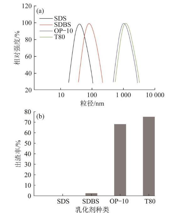 圖1乳化劑種類對產品粒徑中值(a)和出渣率(b)的影響