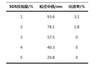 在SDS為乳化劑、產品有效質量分數為12%條件下,考察SDS投加量對產品粒徑中值、穩定性的影響,結果見表1。
