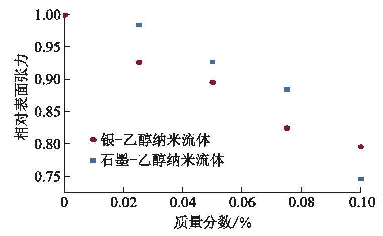 表面張力是決定τH的關(guān)鍵參數(shù),采用重力法對(duì)不同質(zhì)量分?jǐn)?shù)納米流體的表面張力進(jìn)行了測(cè)量。結(jié)果如圖1所示,隨著納米顆粒質(zhì)量分?jǐn)?shù)的增大,相對(duì)表面張力逐漸減小。納米流體中的部分石墨顆粒會(huì)漂浮于液滴表面,疏水性較好的納米顆粒,使原本光滑平整的氣液兩相界面變得粗糙,減小了流體的表面張力。當(dāng)納米顆粒質(zhì)量分?jǐn)?shù)達(dá)到0.1%時(shí),納米流體的表面張力減小了17%——25%.