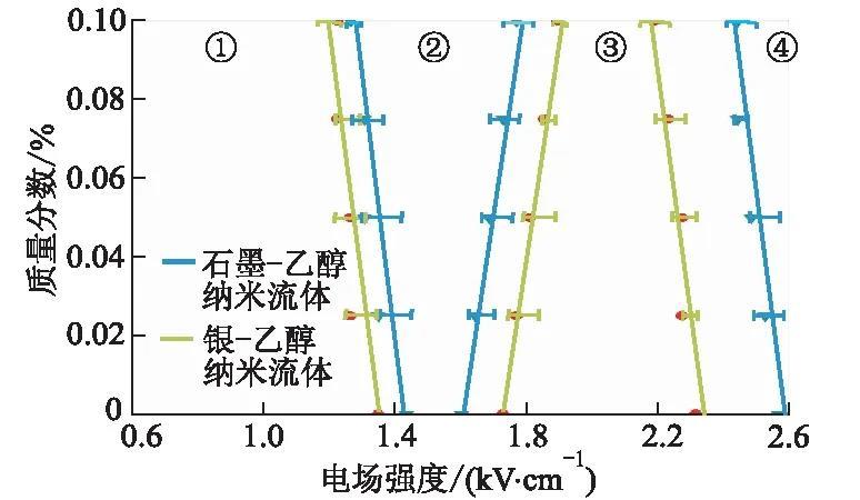加入納米顆粒后τc/τH的變化如表1所示。納米顆粒的加入使得τc/τH逐漸升高并更接近于1,這表明納米顆粒的加入讓流體表面毛細(xì)波受到表面電荷遷移的阻尼逐漸升高,加速了流體由滴狀模式向紡錘模式的轉(zhuǎn)變,使得模式轉(zhuǎn)變所需臨界電場(chǎng)強(qiáng)度逐漸降低。在質(zhì)量分?jǐn)?shù)相同時(shí),石墨~乙醇納米流體的τc/τH始終小于銀~乙醇納米流體的τc/τH,因此,由滴狀模式進(jìn)入紡錘模式時(shí)石墨~乙醇納米流體所需電場(chǎng)強(qiáng)度更高(圖2區(qū)間①→②)。