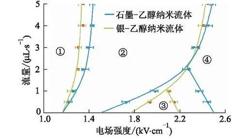 流量是影響納米流體霧化特性的另一重要參數(shù)。尋找在較大流量下依然能保持穩(wěn)定霧化效果的區(qū)間,對(duì)工業(yè)應(yīng)用具有十分重要的意義。質(zhì)量分?jǐn)?shù)為0.1%的納米流體在不同流量下霧化模式隨電壓的變化區(qū)間如圖3所示,區(qū)間①為滴狀模式,區(qū)間②為紡錘模式,區(qū)間③為錐射流模式,區(qū)間④為多股射流模式。相同電場(chǎng)強(qiáng)度下隨著流量的增加,單位體積流體荷電量也隨之減小。因此,流體從滴狀模式進(jìn)入紡錘模式所需電場(chǎng)強(qiáng)度逐漸升高(圖3區(qū)間①→②)。由圖3區(qū)間②可知,隨著流量的增大紡錘模式所占區(qū)間逐漸增大。低流速(<2μL·s-1)狀態(tài)下,電場(chǎng)強(qiáng)度增大,流體表面集聚大量電荷,致使液體表面張力降低,霧化模式也就從紡錘模式逐步向錐射流模式過(guò)渡(圖3區(qū)間②→③)。納米流體的錐射流模式僅僅發(fā)生在流量低于2μL·s-1時(shí),并且隨著流量的增大,錐射流模式所在區(qū)間迅速減小直至消失(圖3區(qū)間③)。電場(chǎng)對(duì)流體荷電的能力有限,流量的增加使得流體不穩(wěn)定性增大,大部分電荷無(wú)法聚集至液錐表面,從而導(dǎo)致錐射流模式隨著流量的增大,其霧化區(qū)間迅速消失。
