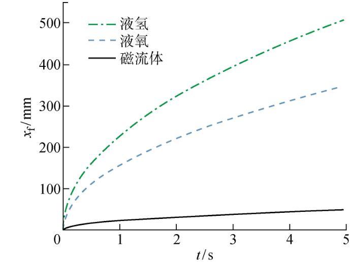 液氫、液氧等低溫推進劑由于黏度小,其在內角毛細流動流量上高于磁流體一個數量級以上。盡管液氫的表面張力小,但其低黏度的特性在微重力流動中起主導性作用,導致其內角流動速度高于液氧和磁流體。