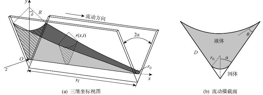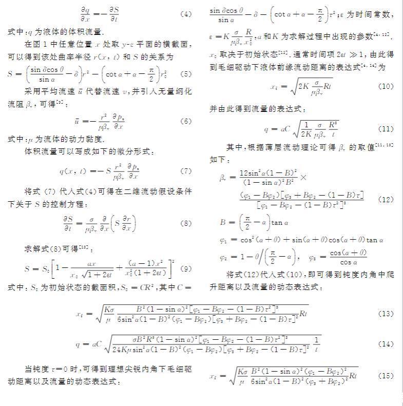 當液體從一端進入內角時,在表面張力作用下沿x方向的曲率半徑逐漸減小,從而在液體內部形成壓強梯度。在流動的任意位置x,氣液交界面的壓強差可以表示為