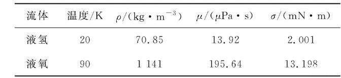 相較于常規推進劑,以液氫/液氧為代表的低溫推進劑具有高比沖、無毒、無污染等諸多優勢,是目前以及未來很長一段時間內空間工程的首選推進劑。然而,低溫推進劑沸點低、汽化潛熱低等特殊物性,為其長期空間貯存和在軌管理技術帶來巨大挑戰。因此,對于低溫推進劑,采用表面張力式流體液體管理裝置是解決其空間應用難題的關鍵突破點?;谇拔牡拿毩鲃幽P?,對液氫、液氧兩種流體的內角流動情況進行計算分析。液氫和液氧的物理性質參數如表1所示。為了與空間貯箱中的應用一致,采用低溫流體在不銹鋼表面上的接觸角(近似為0°)。