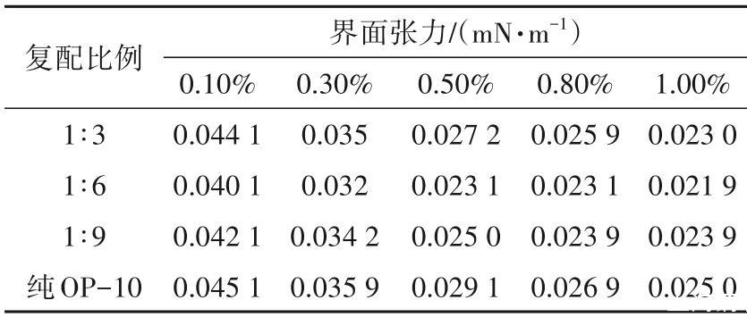 將HPAM配制成質量分數為0.10%的水溶液,與不同濃度的OP-10按不同比例復配,并測定不同復配體系的界面活性,結果見表3。