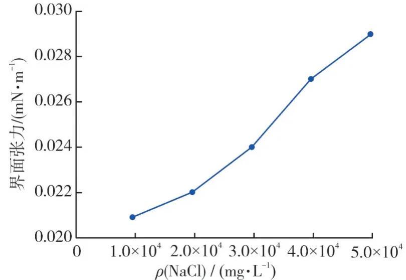 由圖4和5可知:隨著Na+濃度的增加,復配體系的油水界面張力值雖然不斷上升,但是當礦化度上升至50 000 mg/L時,界面張力值增幅很小,僅增加了0.008 mN/m。當Ca2+質量濃度增加至1 000 mg/L時,界面張力值增幅也很小,僅上升了0.007 mN/m。這兩種現象證明了隨著礦化度的增加,復配體系仍然具有較好的抗鹽性能,這也正是非離子表面活性劑的特點。