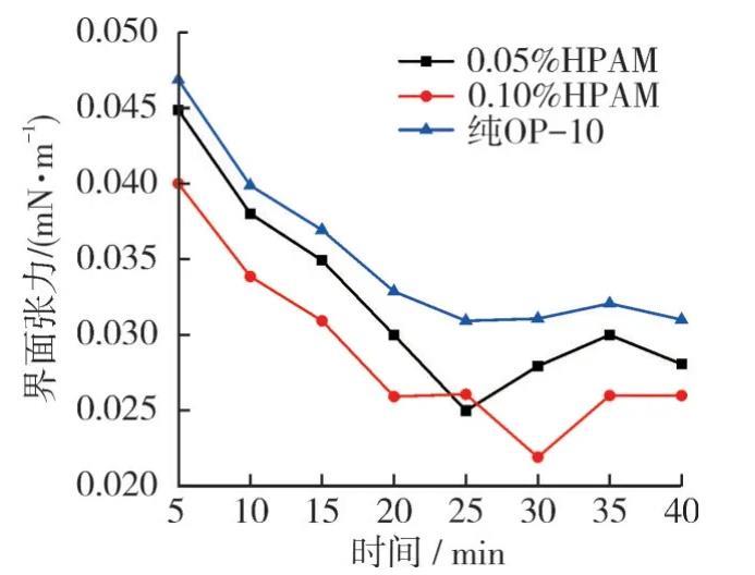 3)與純OP-10相比,0.05%和0.10%質量分數的HPAM與OP-10的復配體系的界面張力最小值和穩定值都有所下降,且隨著HPAM質量分數的增加,界面張力降低更為明顯,進一步證明了HPAM與OP-10之間確實發生了相互作用,存在一定的協同效應。