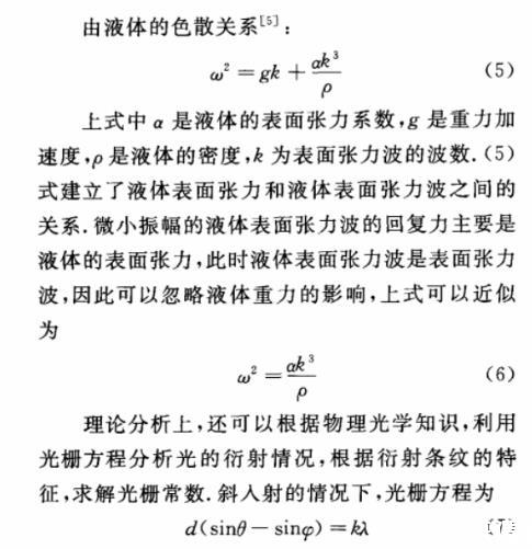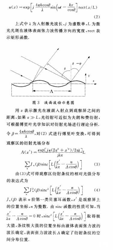(2)理論上分析了表面張力波的光衍射效應,得到了衍射光場的解析表達式。根據衍射光場和表面張力波之間的關系,進一步可求得液體的表面張力系數。