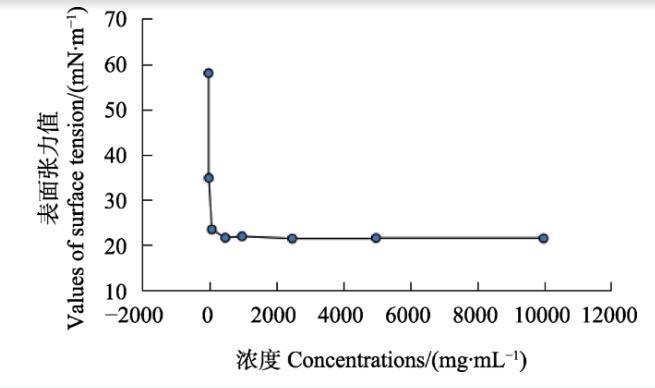 按國家標準GB 5549—2010的方法,將助劑380配置成1、10、100、1000、10 000、100 000 mg/mL系列濃度,用表面張力儀測定相應濃度藥液的表面張力。以濃度和其對應的表面張力值分別為橫縱坐標作圖,獲得一條曲線,曲線拐點對應的濃度即為助劑380的臨界膠束濃度。