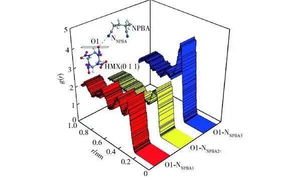 由于體系的原子種類較多,考慮到篇幅因素,且相對(duì)于氮原子,—NO2基團(tuán)中氧原子與其他極性分子間的作用力更強(qiáng),為此僅選取了HMX(0 1 1)晶面上—NO2基團(tuán)中氧原子,對(duì)其與NPBA分子基團(tuán)上極性原子間的徑向分布函數(shù)進(jìn)行了計(jì)算,并根據(jù)徑向分布函數(shù)曲線峰的位置和高低判斷原子間的作用力類型和強(qiáng)弱。
