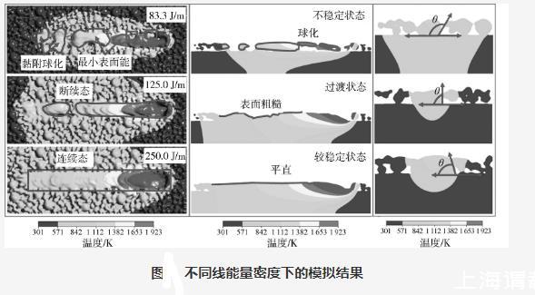 為分析線能量密度對球化缺陷形成機理的影響,選取激光功率150 W,線能量密度分別為83.3 J/m、125.0 J/m和250.0 J/m的3組參數進行數值模擬,結果如圖2所示。當線能量密度為83.3 J/m時,部分熔融金屬凝固并與周圍粉末黏附成球;部分熔融金屬在表面張力的驅使下傾向于減少表面能,迅速地成球;這兩種成球方式往往共同出現。這是因為激光的穿透深度沒有到達基板,此時接觸角為180°,呈現不完全濕潤狀態,液態金屬流動受阻,因此不能在基板上鋪展。當線能量密度提高到125.0 J/m時,單道由球化形態向斷續態過渡,雖然表面還比較粗糙,但是球化效應明顯減弱,此時激光穿透深度剛剛到達基板,接觸角約為90°。當線能量密度繼續提高到250.0 J/m時,熔化的金屬粉末形成充足的熔融金屬,從而改善其流動性,凝固后獲得高度均勻和連續的單道,激光穿透深度能夠穿透粉末床并熔化基板,并且接觸角大于90°。因此,球化缺陷的形成機理可以總結為能量密度太低,熔融金屬不能在基板上鋪展。判斷是否球化最直接的依據是觀察熔池深度是否穿透粉末層厚,并熔化了基板,也可以計算熔池的接觸角是否小于90°來判斷熔池的濕潤性。此外,還可通過適當提高線能量密度,提高熔融金屬的流動性,以獲得更均勻和連續的單道。