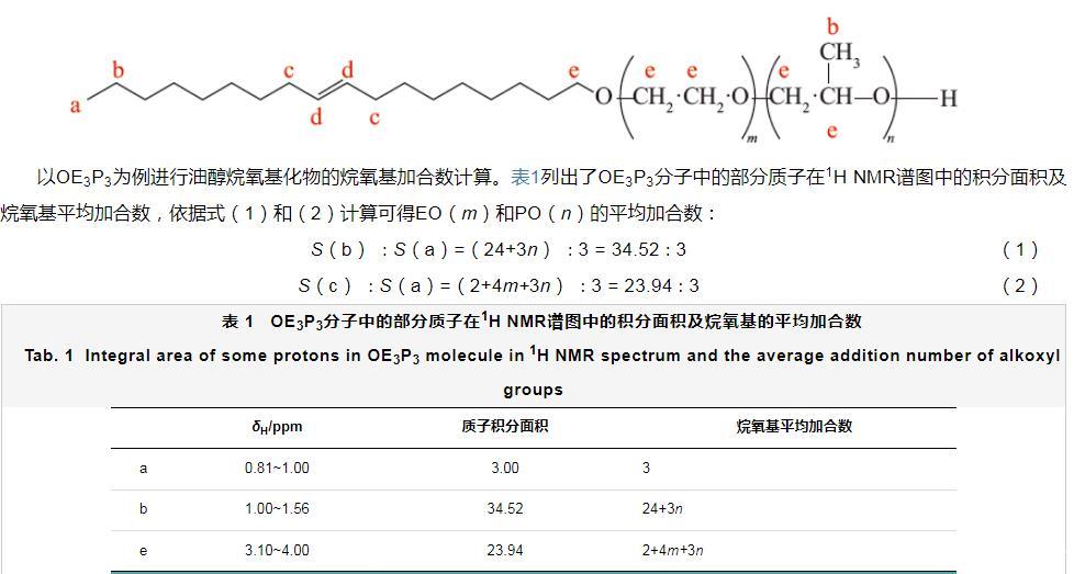以OE3P3為例進行油醇烷氧基化物的烷氧基加合數計算。表1列出了OE3P3分子中的部分質子在1H NMR譜圖中的積分面積及烷氧基平均加合數,依據式(1)和(2)計算可得EO(m)和PO(n)的平均加合數: