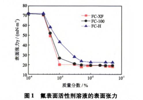 本研究的目的是獲得具有低表/界面張力且與巖石達到近似于中性潤濕的助排劑。首先,需要選擇表面活性劑。表面活性劑溶液達到臨界膠束濃度(cmc)后的表面張力(γcmc)是該表面活性劑溶液能夠獲得的最低表面張力。根據(jù)常見表面活性劑的γcmc數(shù)據(jù),氟表面活性劑能夠使水溶液達到更低的表面張力。因此,在新型助排劑中將選用合適的氟表面活性劑以降低溶液的表面張力。其次,選擇潤濕性改變劑。要達到與巖石接近中性潤濕,需要調(diào)節(jié)助排劑在巖石表面的吸附作用,以改變巖石表面的性質(zhì)使助排劑體系與巖石潤濕接觸角在75°~105°間(90°±15°)。此外,由于氟表面活性劑和潤濕性改變劑一般只能使油水界面張力降低到1 mN/m以上,因此要借鑒化學驅(qū)提高采收率中能夠與原油達到超低界面張力的表面活性劑的選擇方法,復配合適的碳氫表面活性劑以獲得能夠同時降低界面張力的助排劑體系。