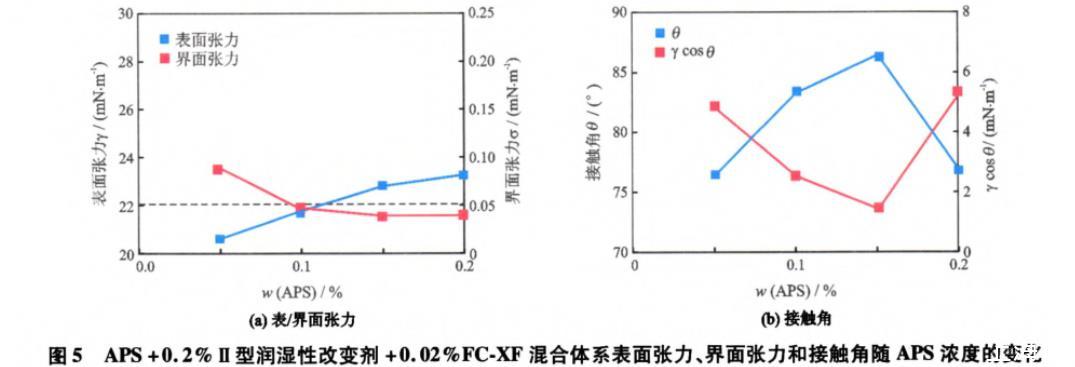 從圖5(a)中可以看出,隨著APS質(zhì)量分數(shù)的增加,體系的表面張力增大,界面張力減小,這與FXCF對表/界面張力的影響機制相同。從圖5(b)中可以看出,隨著APS質(zhì)量分數(shù)的增加,體系與巖石的接觸角先增加再減小,相應的γcosθ先減小再增大,均出現(xiàn)極值點,這與圖4(b)的變化趨勢不同。這是因為吸附Ⅱ型潤濕性改變劑和FC-XF使得巖石表面由水濕轉變?yōu)槿跤H水性潤濕(接觸角<75°),更易于吸附APS的親水頭基而使碳氫鏈在巖石表面暴露,這降低了巖石表面的親水性,因而隨著APS質(zhì)量分數(shù)的增加接觸角增大。但是,當APS質(zhì)量分數(shù)大于0.15%后,過多的APS分子可能在巖石表面發(fā)生雙分子層吸附或因競爭吸附而降低Ⅱ型潤濕性改變劑的吸附量,使得巖石表面的親水性增加。而且,接觸角的變化決定了γcosθ的變化趨勢,因而接觸角和γcosθ隨APS質(zhì)量分數(shù)的變化曲線中均出現(xiàn)極值點。