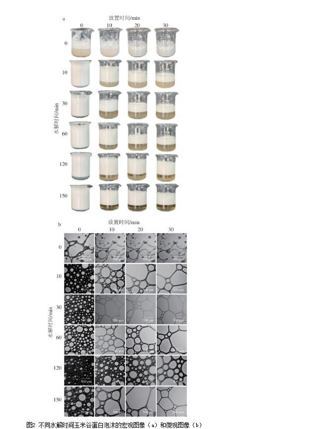 圖2不同水解時(shí)間玉米谷蛋白泡沫的宏觀圖像(a)和微觀圖像(b)