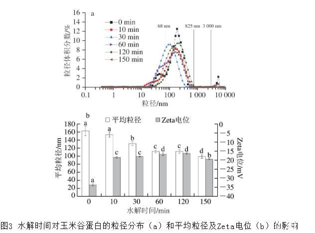 圖3水解時(shí)間對(duì)玉米谷蛋白的粒徑分布(a)和平均粒徑及Zeta電位(b)的影響