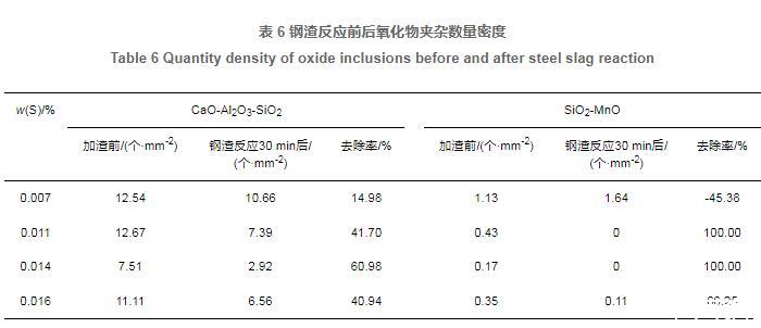 分析鋼渣反應(yīng)前后夾雜物的成分可知,重軌鋼中氧化物夾雜分為SiO2-MnO系和CaO-Al2O3-SiO2系兩類夾雜,圖8所示為兩類典型夾雜二維形貌。各類氧化物夾雜在鋼渣反應(yīng)前后數(shù)量密度變化見表6??梢钥闯?,鋼中主要夾雜為鈣鋁硅酸鹽,因此鋼渣反應(yīng)30 min后,鈣鋁酸鹽的去除率同總氧化物夾雜的去除率相近,隨著氧、硫質(zhì)量分?jǐn)?shù)的增高,鈣鋁酸鹽的去除率呈升高的趨勢(shì)。由于鋼中硅錳夾雜數(shù)量較少,且掃描面積有限,僅從以上表格統(tǒng)計(jì)的數(shù)量密度不具代表性,因此其去除率未呈現(xiàn)明顯規(guī)律。