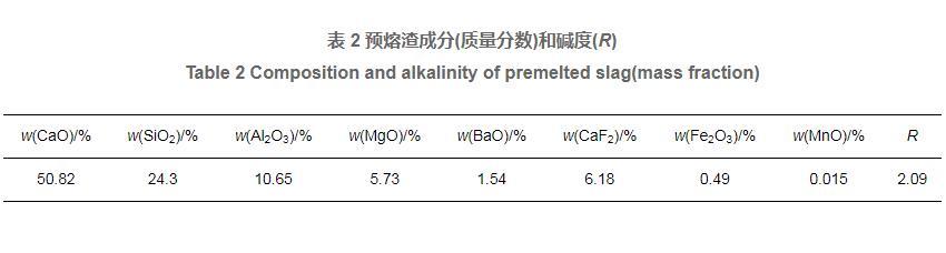 表2預(yù)熔渣成分(質(zhì)量分?jǐn)?shù))和堿度(R)