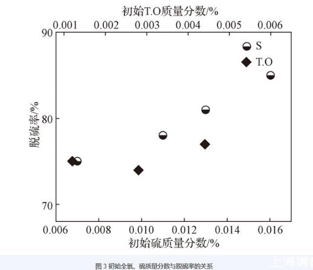 檢測(cè)每爐試樣1和試樣2的硫和全氧質(zhì)量分?jǐn)?shù),結(jié)果見表3??梢钥闯?,固定鋼中全氧質(zhì)量分?jǐn)?shù),隨著初始硫質(zhì)量分?jǐn)?shù)的升高,鋼渣反應(yīng)30 min后,脫硫率逐漸增大,且穩(wěn)定在74%以上,終點(diǎn)硫質(zhì)量分?jǐn)?shù)可降低到0.002 6%以下;固定鋼中硫質(zhì)量分?jǐn)?shù),隨著初始全氧質(zhì)量分?jǐn)?shù)的升高,終點(diǎn)全氧質(zhì)量分?jǐn)?shù)可降低到0.001 4%以下,終點(diǎn)硫質(zhì)量分?jǐn)?shù)可降低到0.001 8%以下,皆滿足重軌鋼的成分要求。鋼中初始硫、全氧質(zhì)量分?jǐn)?shù)與脫硫率的關(guān)系如圖3所示。
