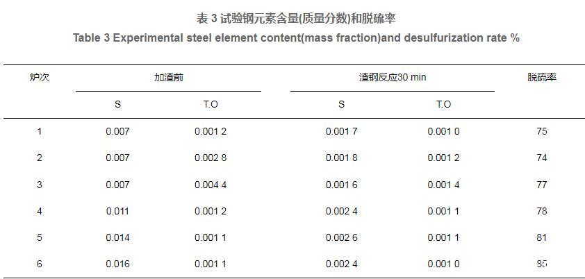 表3試驗(yàn)鋼元素含量(質(zhì)量分?jǐn)?shù))和脫硫率
