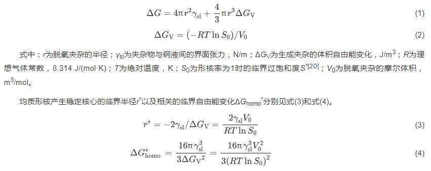 實(shí)際煉鋼脫氧的過程中,新相形核是以均質(zhì)形核和非均質(zhì)形核2種方式進(jìn)行的。脫氧生成1個(gè)半徑為r的球形夾雜時(shí),總自由能的變化為ΔG,在數(shù)值上為生成新相產(chǎn)生的表面能和引起體積變化的自由能之和[20],見式(1)。生成夾雜的體積自由能變化ΔGV見式(2)。