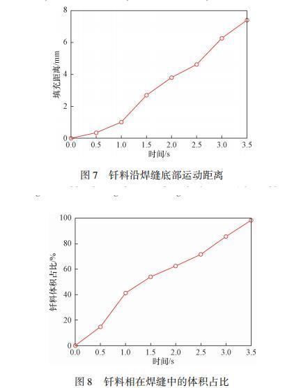 液態(tài)釬料沿著焊縫下表面的填充距離如圖7所示。前1s內(nèi),釬料未潤(rùn)濕焊縫下表面,曲線上表示為釬料豎直向下運(yùn)動(dòng)的距離,此時(shí)鋪展速度較為緩慢。當(dāng)釬料直接接觸焊縫下表面時(shí),驅(qū)動(dòng)力增強(qiáng),加速了釬料的鋪展。焊接過(guò)程中可能會(huì)出現(xiàn)微小氣泡從而影響焊接強(qiáng)度,故統(tǒng)計(jì)了焊縫內(nèi)不同時(shí)刻下釬料體積占總體積的比值(圖8)。在t=1s之前,前沿流動(dòng)速度較小,但由于填充截面面積較大,總體鋪展速度仍處于較高的水平。當(dāng)釬料開(kāi)始向兩側(cè)流動(dòng),鋪展速度略微下降。最終得到的釬料填充體積占比達(dá)到98.5%,表明焊縫填充效果良好。