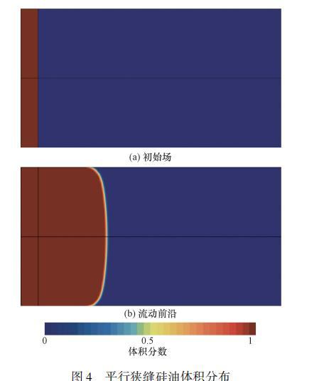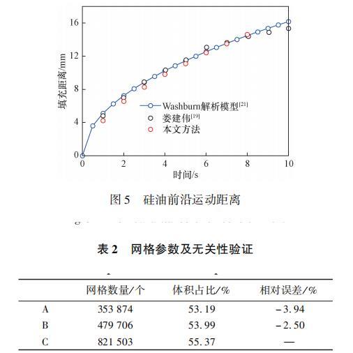 根據(jù)式(6)與式(7)可以看出,這類由表面張力驅(qū)動(dòng)的流動(dòng)與邊界處接觸角緊密相關(guān)。為保證接觸角施加方法的正確性,對(duì)表面張力驅(qū)動(dòng)下的平行平板流動(dòng)進(jìn)行了計(jì)算,并將結(jié)果與前人的數(shù)值模擬結(jié)果進(jìn)行了對(duì)比。驗(yàn)證模型為15mm×8mm×0.4mm的平行平板,所采用材料為硅油,具體物性參數(shù)如表1所示。首先將平板前端部分區(qū)域內(nèi)充滿硅油,以此為初始場(chǎng)進(jìn)行計(jì)算[圖4(a)]。圖4(b)為計(jì)算一段時(shí)間后得到的流動(dòng)前沿,最終得到的前沿最大高度隨時(shí)間變化如圖5所示,計(jì)算結(jié)果與前人數(shù)值模擬結(jié)果及Washburn解析模型吻合良好,證明了基于VOF模型的數(shù)值方法計(jì)算硅油填充平板過(guò)程的準(zhǔn)確性。