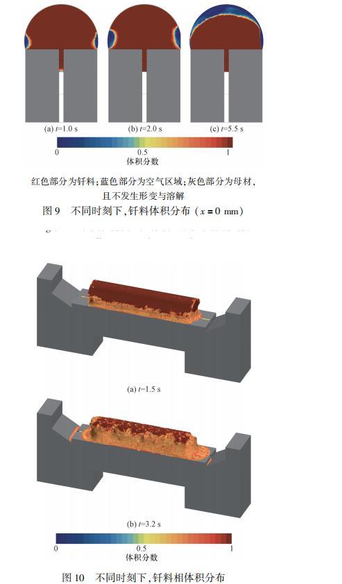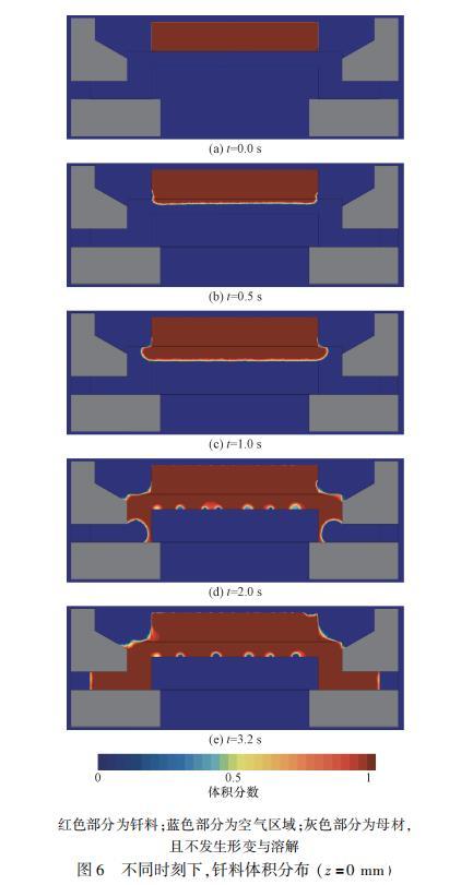 為充分評(píng)估釬料填充焊縫的流動(dòng),給出了不同時(shí)刻下x=0mm截面處的釬料體積分布(圖9),截面兩側(cè)釬料融化過(guò)程基本呈對(duì)稱分布。涂覆釬料從底部開(kāi)始融化,并不斷填充焊縫,兩側(cè)慢慢形成了“凹”形液面。隨著保溫過(guò)程進(jìn)行,釬料均融化為液態(tài),液態(tài)釬料在表面張力的作用下收縮為半球形狀。