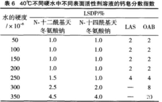表6 40℃不同硬水中不同表面活性劑溶液的鈣皂分散指數(shù)