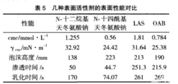 對N-十四酰基天冬氨酸鈉鹽的幾項表面性能進(jìn)行了測定,并與其他表面活性劑進(jìn)行了對比,結(jié)果見表5。