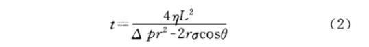 從式(1)可以看出,助排劑的表/界面張力越低,巖石越接近中性潤濕,則毛細管力越小,越有利于返排。另外,根據Poiseulle方程,當排驅壓差為△p(MPa)時,從半徑為r(m),長為L(m)的毛細管中排出黏度為η(mPa·s),表面張力為σ(mN/m)和接觸角為θ(°)的液體所需時間t(s)的表達式為: