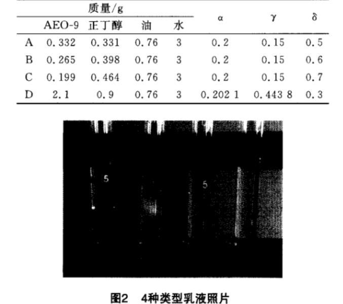 由圖1可見,在所配制的乳液中,既有均相乳液,也有兩相(上相、下相)乳液,同時(shí)有三相(中相)乳液。在選擇典型體系時(shí),應(yīng)體現(xiàn)出全面性,即以上4種類型乳液都涉及到,同時(shí)應(yīng)考慮到漸變性,即固定某個變量(此處固定γ),一種相態(tài)向另一種相態(tài)轉(zhuǎn)變。由此,選出其中4組:A(下相乳液)、B(中相乳液)、C(上相乳液)、D(均相乳液),A、B、C、D的組成如表1所示,形成的乳液照片如圖2所示。分別將乳液部分分離出來,稀釋成質(zhì)量分?jǐn)?shù)為0.1%、0.3%、0.5%、1.0%的微乳液。