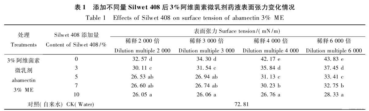 2.1添加不同量Silwet 408對阿維菌素微乳劑藥液表面張力的影響