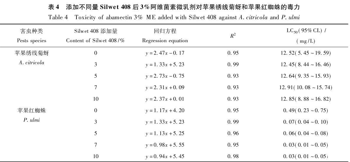 從表4中數(shù)據(jù)可看出:添加Silwet408可明顯提高阿維菌素微乳劑對蘋果紅蜘蛛的毒力,且隨助劑添加量的增加,藥劑LC50值降低;但添加Silwet408對阿維菌素微乳劑對蘋果繡線菊蚜的毒力并無明顯影響。說明Silwet408雖能降低藥液的表面張力及在靶標(biāo)葉面的接觸角,促進(jìn)藥液在葉片上的潤濕性,但并不一定能提高其對害蟲的毒力。