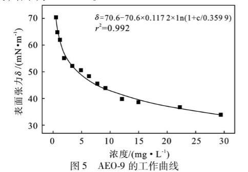 脂肪醇聚氧乙烯醚(AEO-9)是一種非離子表面活性劑,該類表面活性劑是非離子表面活性劑中發展最快、用量最大的品種。AEO-9試樣的表面張力測定結果見表5。